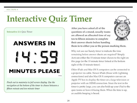 Interactive features include timers and other items to display on television or via projector directly from your iPad, downloadable and printable score sheets and answer sheets, a fully interactive spreadsheet that you can use in Apple Numbers to chart your teams' scores or save onto a laptop and use directly with Microsoft Excel and not forgetting the quiz rounds themselves.