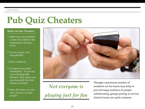 We have tried to keep the layout and overall look of "The BIG Pub Quiz Toolbox" as clear and clean-looking as possible and navigating through the book is as intuitive as Apple users have always come to expect from their devices; namely simple swipe gestures with your finger!
